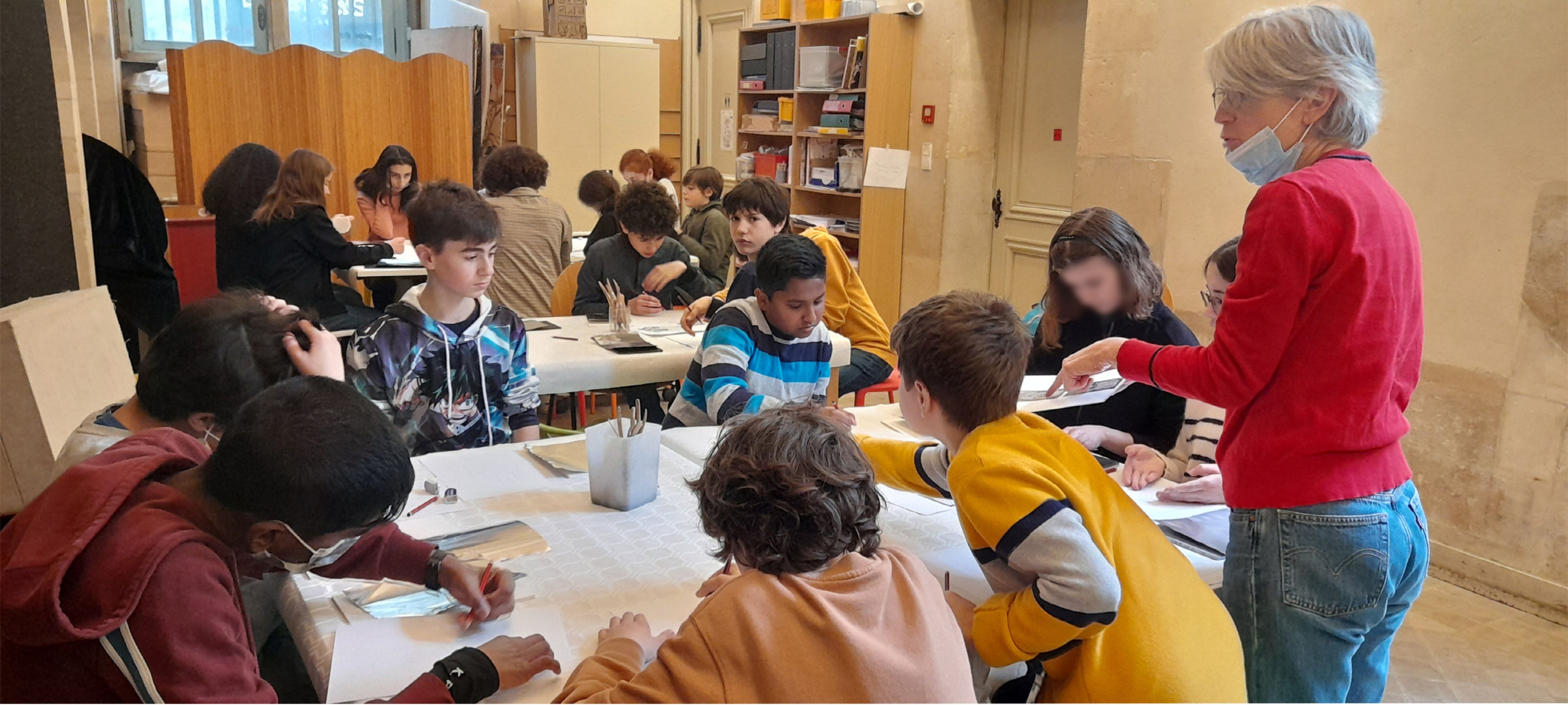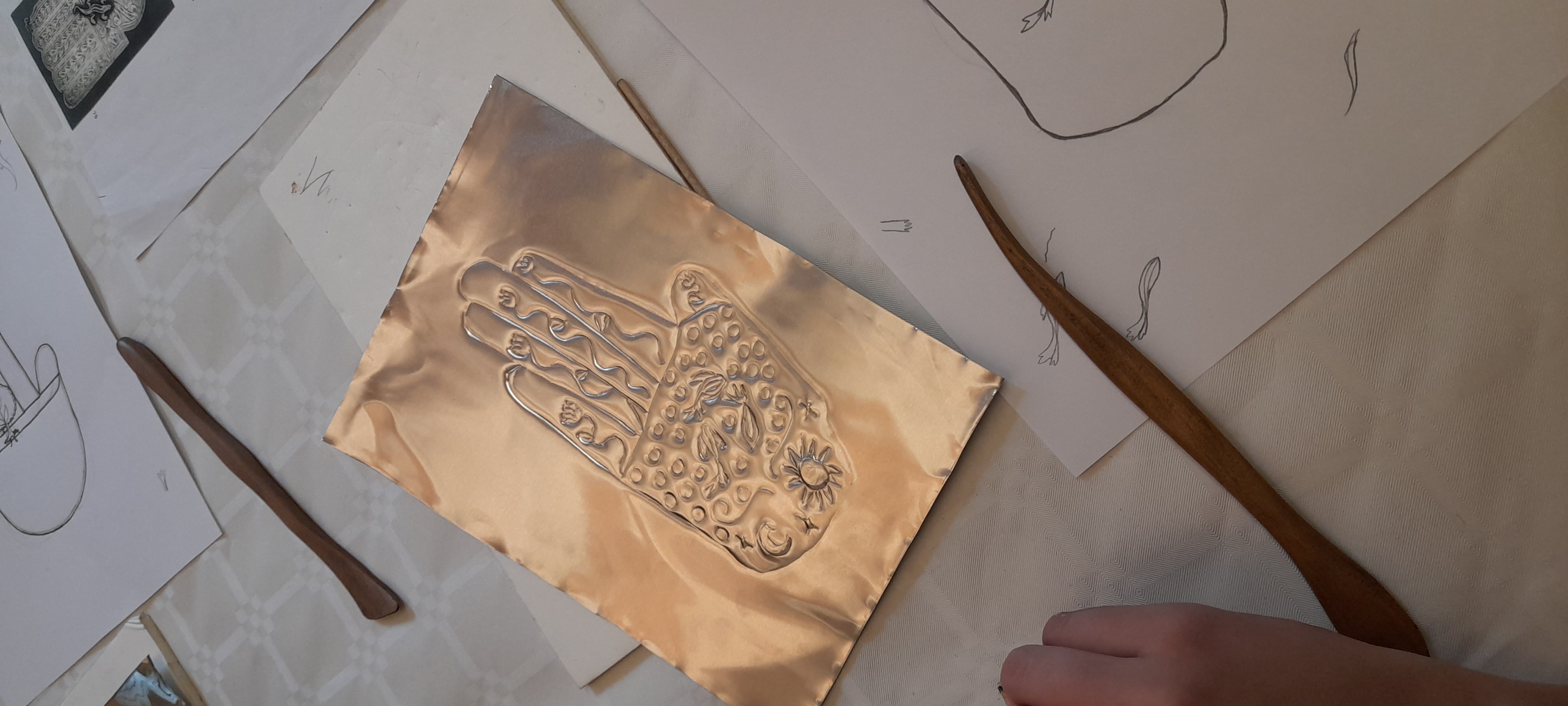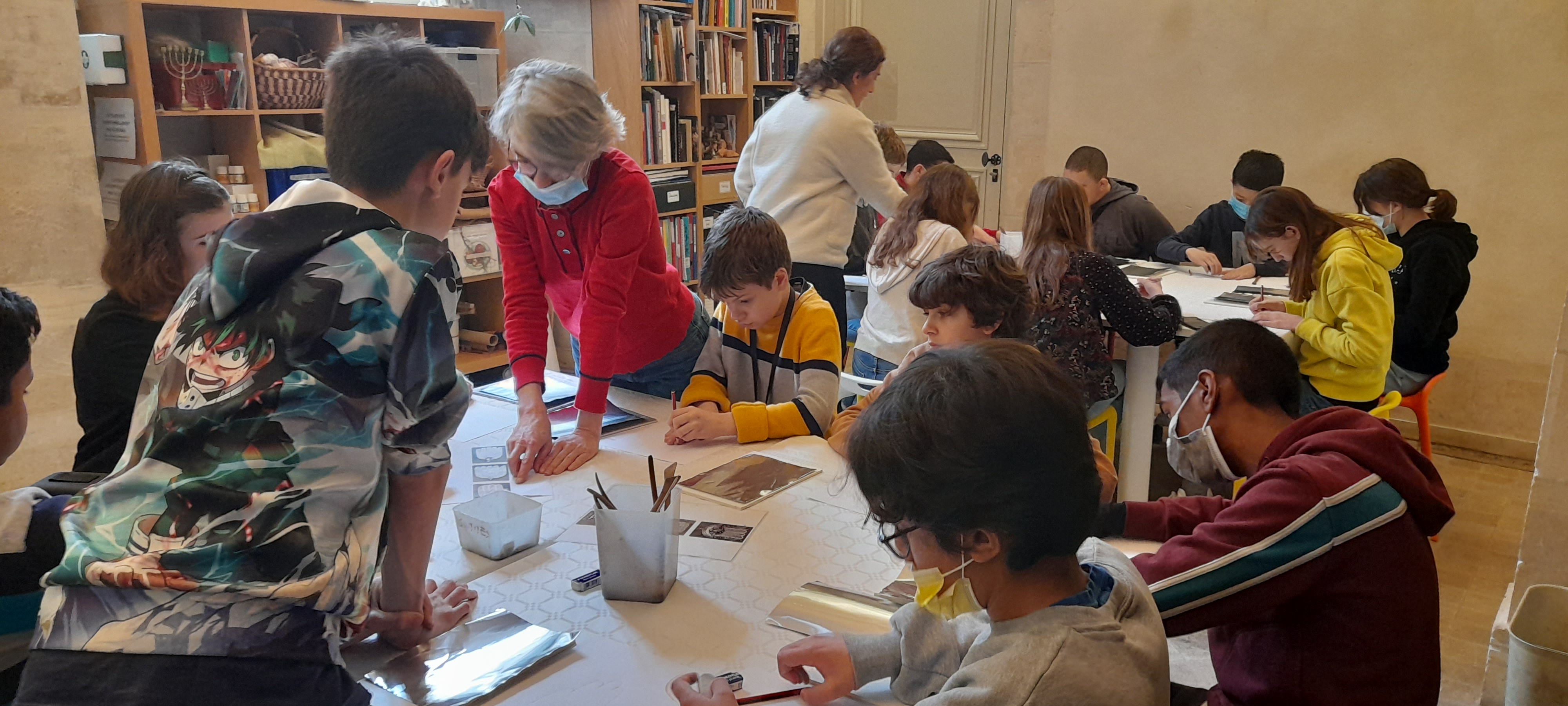 La classe de 5e B s'est rendue au MAHJ, musée d'art et d'histoire du Judaïsme dans le cadre du programme des cours d'histoire "Chrétientés et islams au VIème-XIIème siècles, des mondes en contact" avec le chapitre sur l'étude des sociétés dans l'empire arabo-musulman et en Occident. La visite avait pour but d’aborder, à partir de l’histoire d’Abraham, différentes facettes de cette figure emblématique et leurs résonances dans les traditions monothéistes. Les élèves ont pu assister et participer à un travail créatif sur métal repoussé.