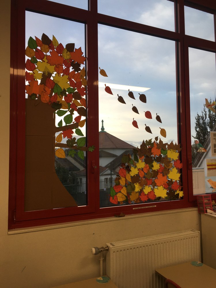 Nous aimons beaucoup dessiner et découper, surtout pour décorer nos classes. Par exemple, toutes les classes ont fait de belles décorations de leurs fenêtres sur le thème de l’automne et de l'hiver !