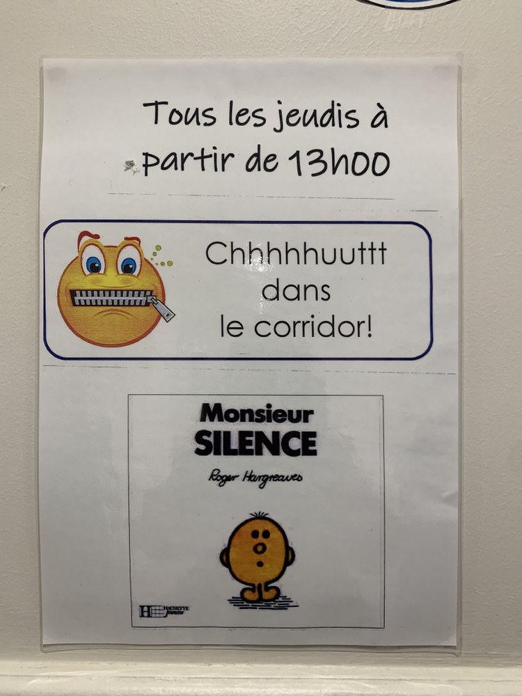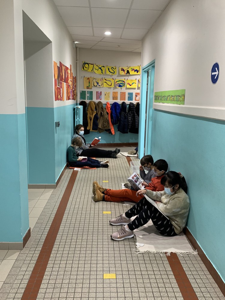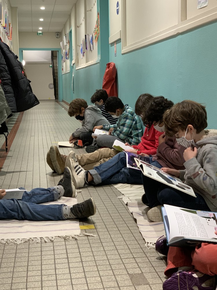 Tous les jeudis à partir de 13h, le temps de s’installer et de choisir son livre, tous les élèves de primaire ont un temps de lecture. On se met où l’on veut, soit dans le couloir sur son tapis, ou alors on reste dans la salle de classe. Le chronomètre est lancé par l’enseignant et plus aucun bruit on est tous concentrés pendant 15min, les yeux rivés sur nos livres.