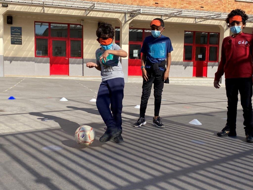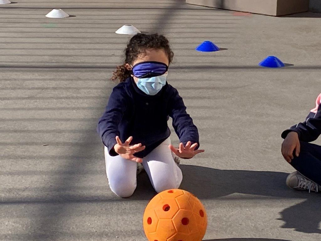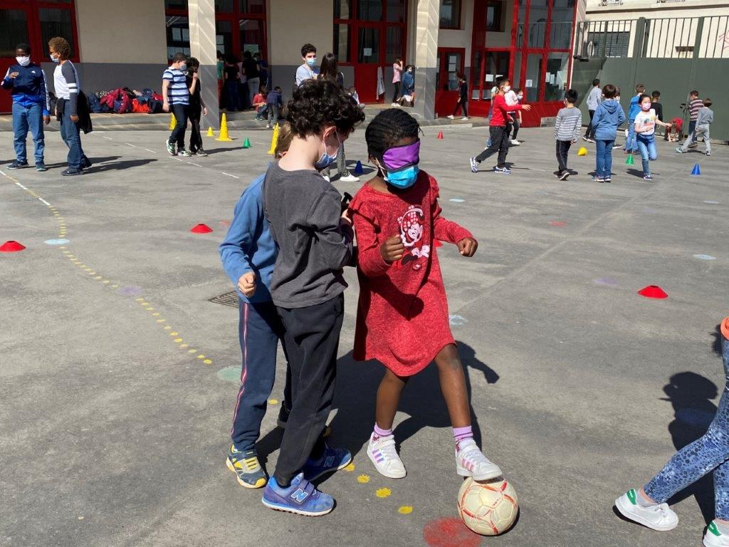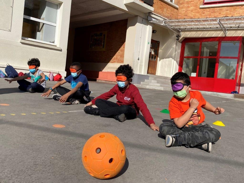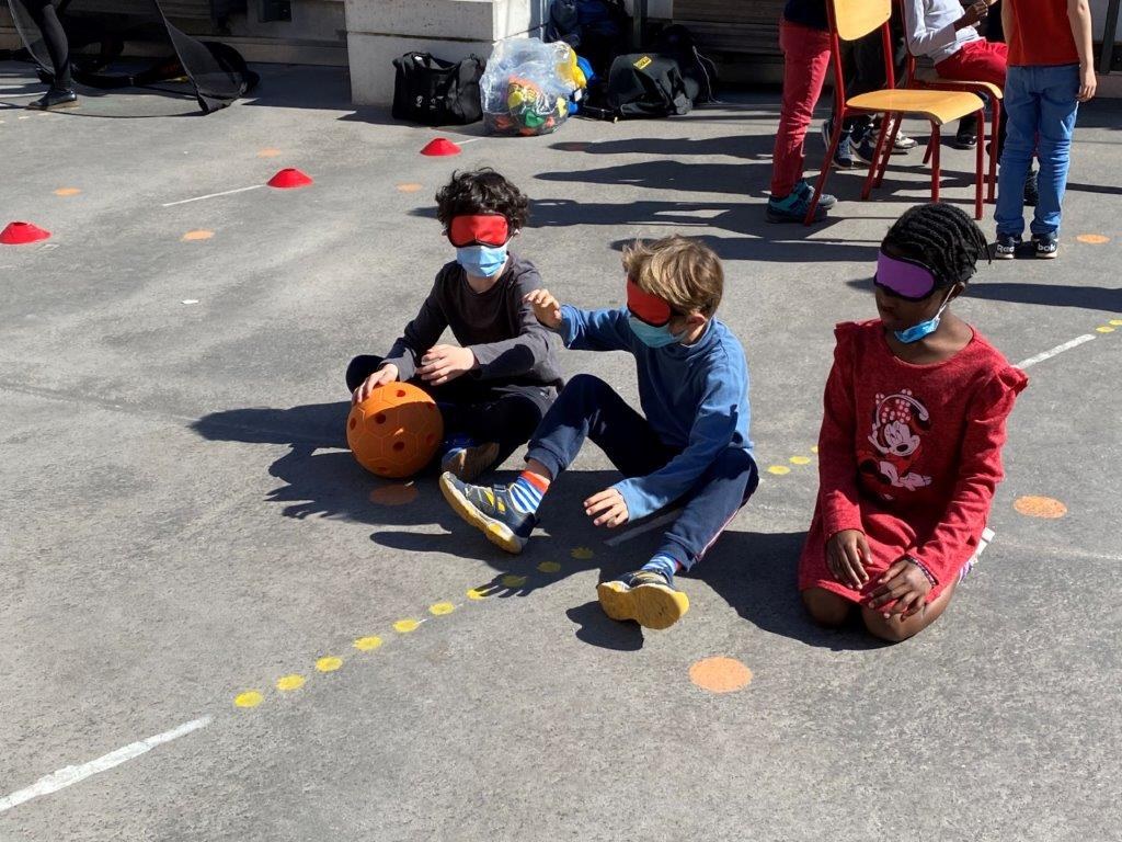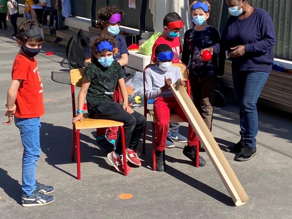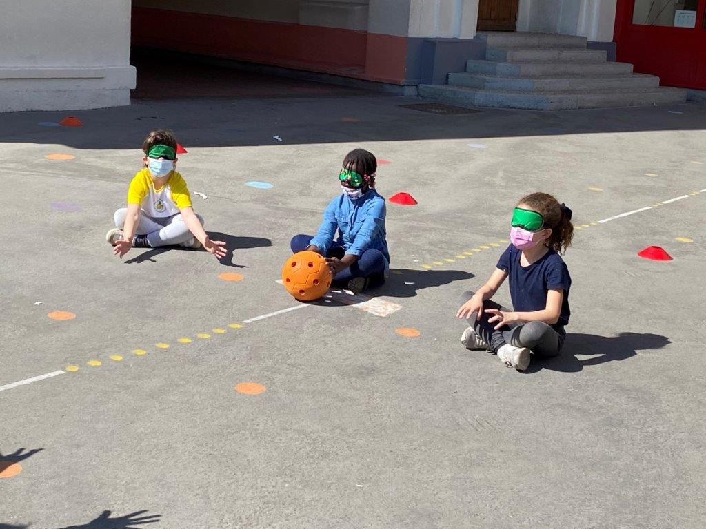 Nous avons aussi fait des jeux sportifs avec des animateurs dans la cour pour mieux comprendre le handisport (les yeux bandés par exemple ou la boccia).