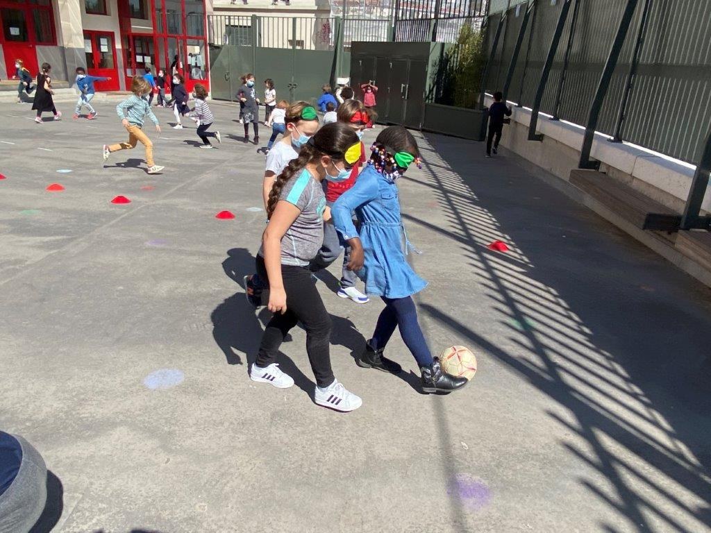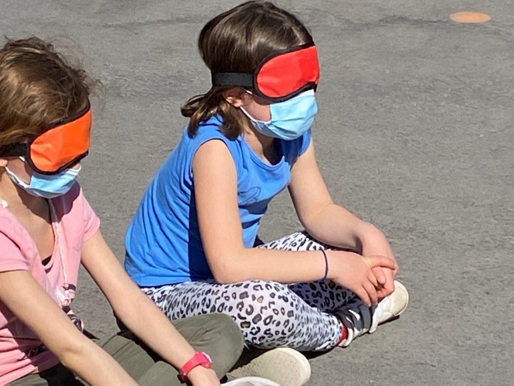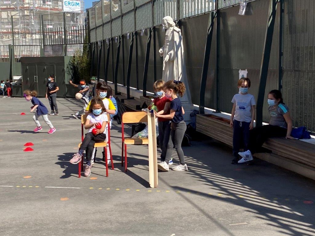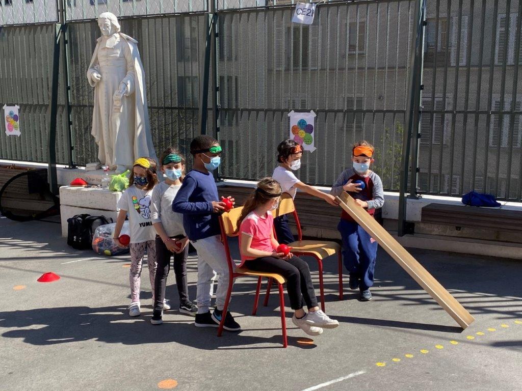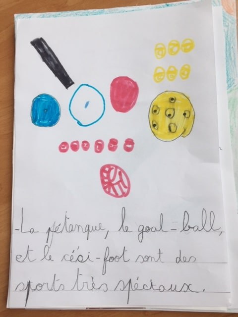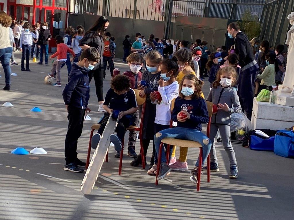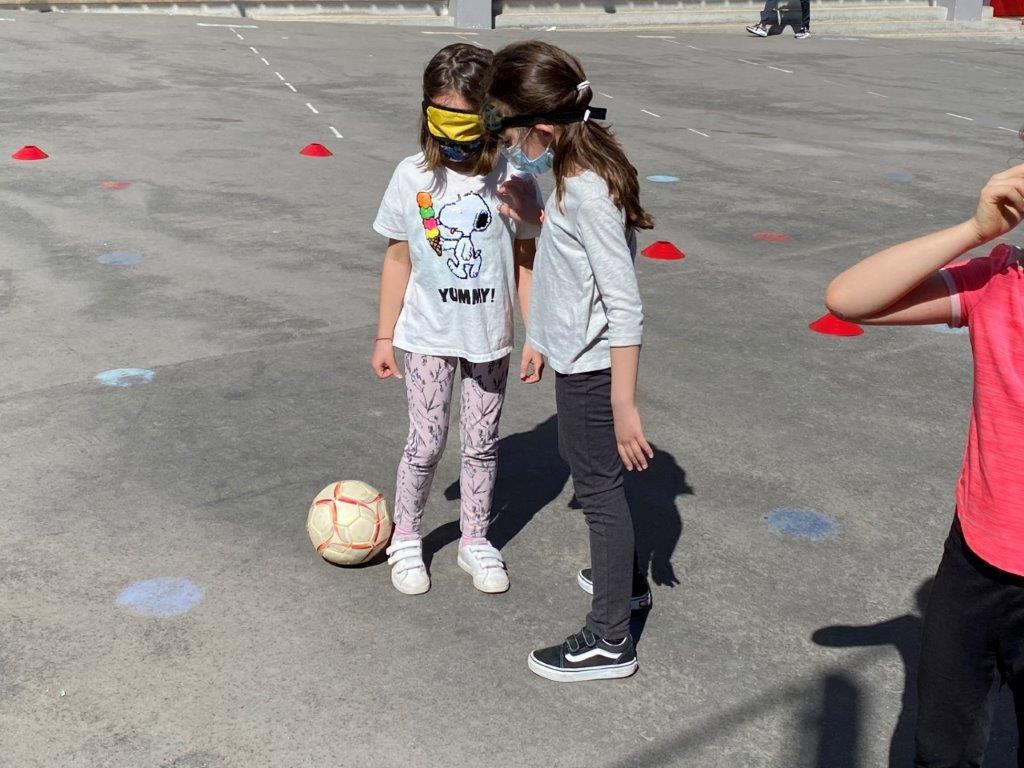 Nous avons aussi fait des jeux sportifs avec des animateurs dans la cour pour mieux comprendre le handisport (les yeux bandés par exemple ou la boccia).